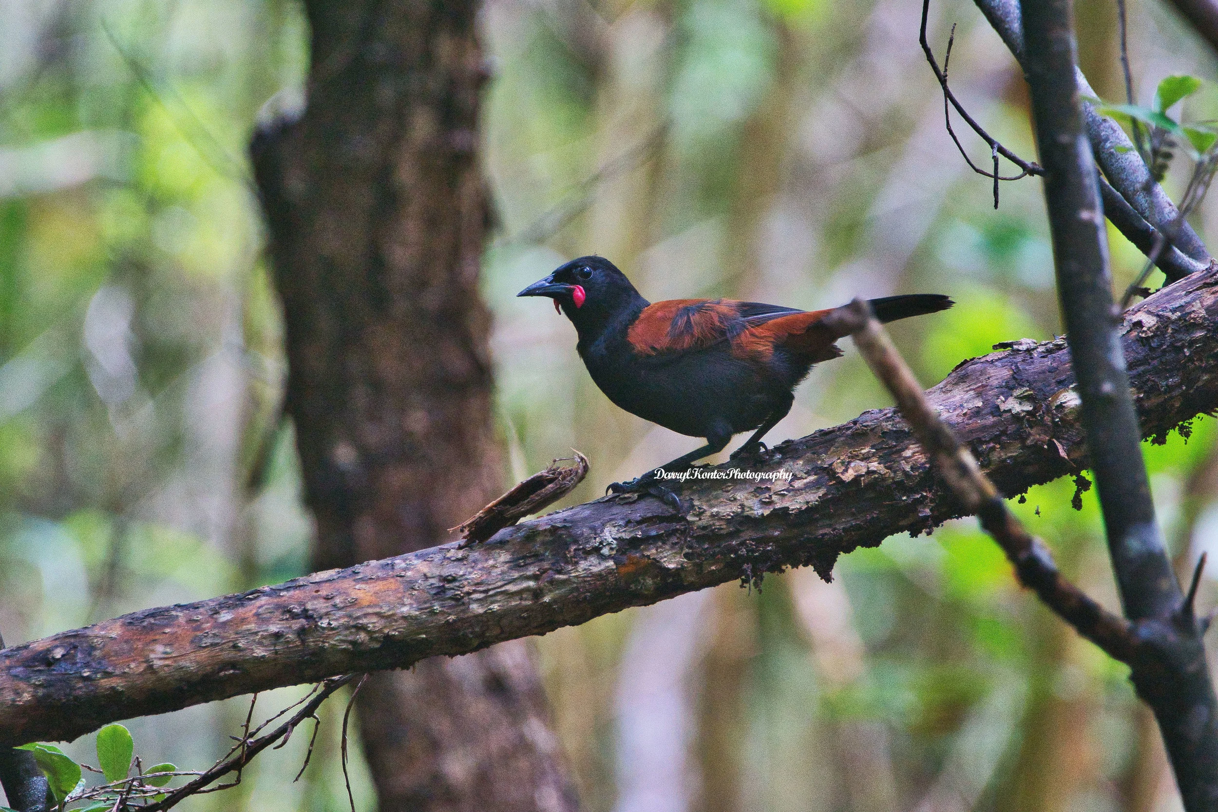 This bird is lucky to be alive. We, meaning humans, almost caused its specie’s extinction. This is the North Island Saddleback. The rust-colored patches on both sides of its back are the reason for the name. The red wattles just below its beak tell you the saddleback is part of the wattlebird family.